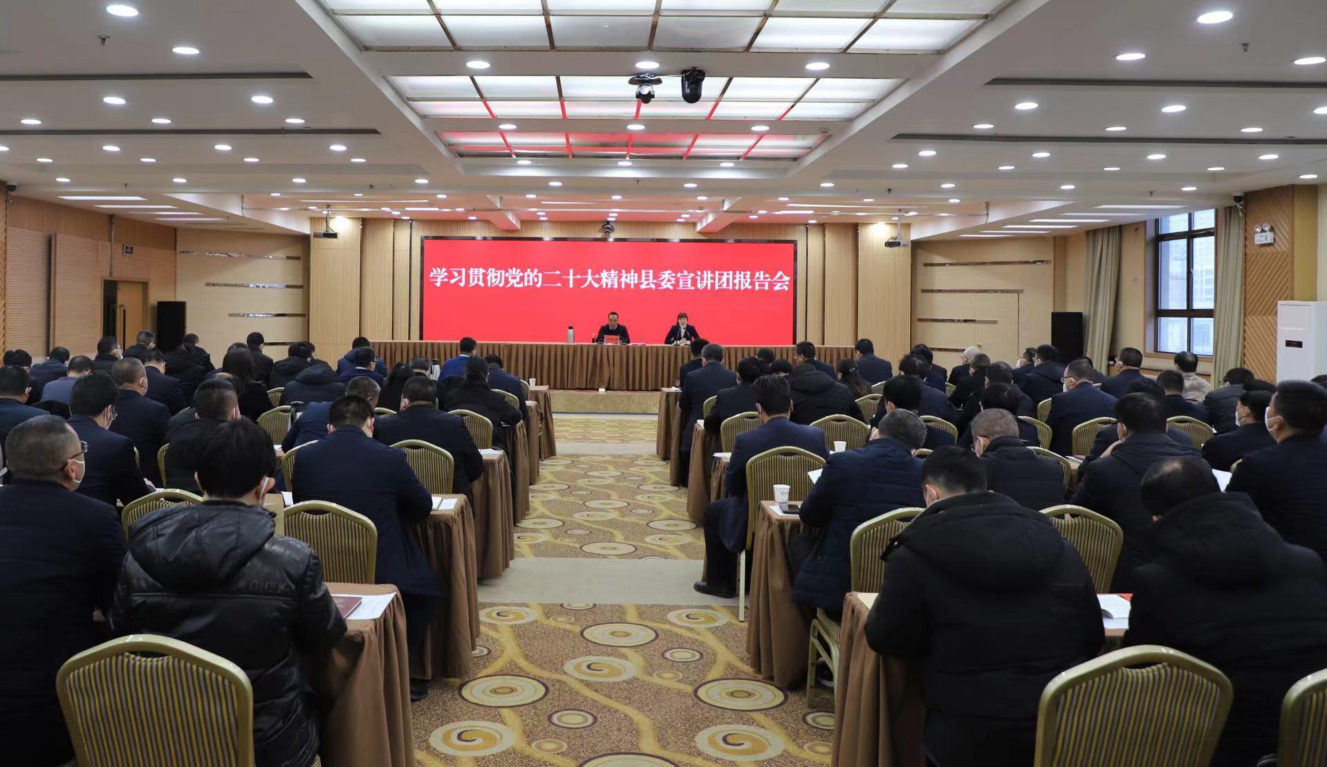 縣委常委、宣傳部部長胡麗霞主持報告會。鄉(xiāng)鎮(zhèn)黨委書記或鄉(xiāng)鎮(zhèn)長、副書記,縣委各部門、縣級國家機關(guān)各部門、各人民團體、駐縣有關(guān)單位負責人,縣委講師團成員參加報告會。