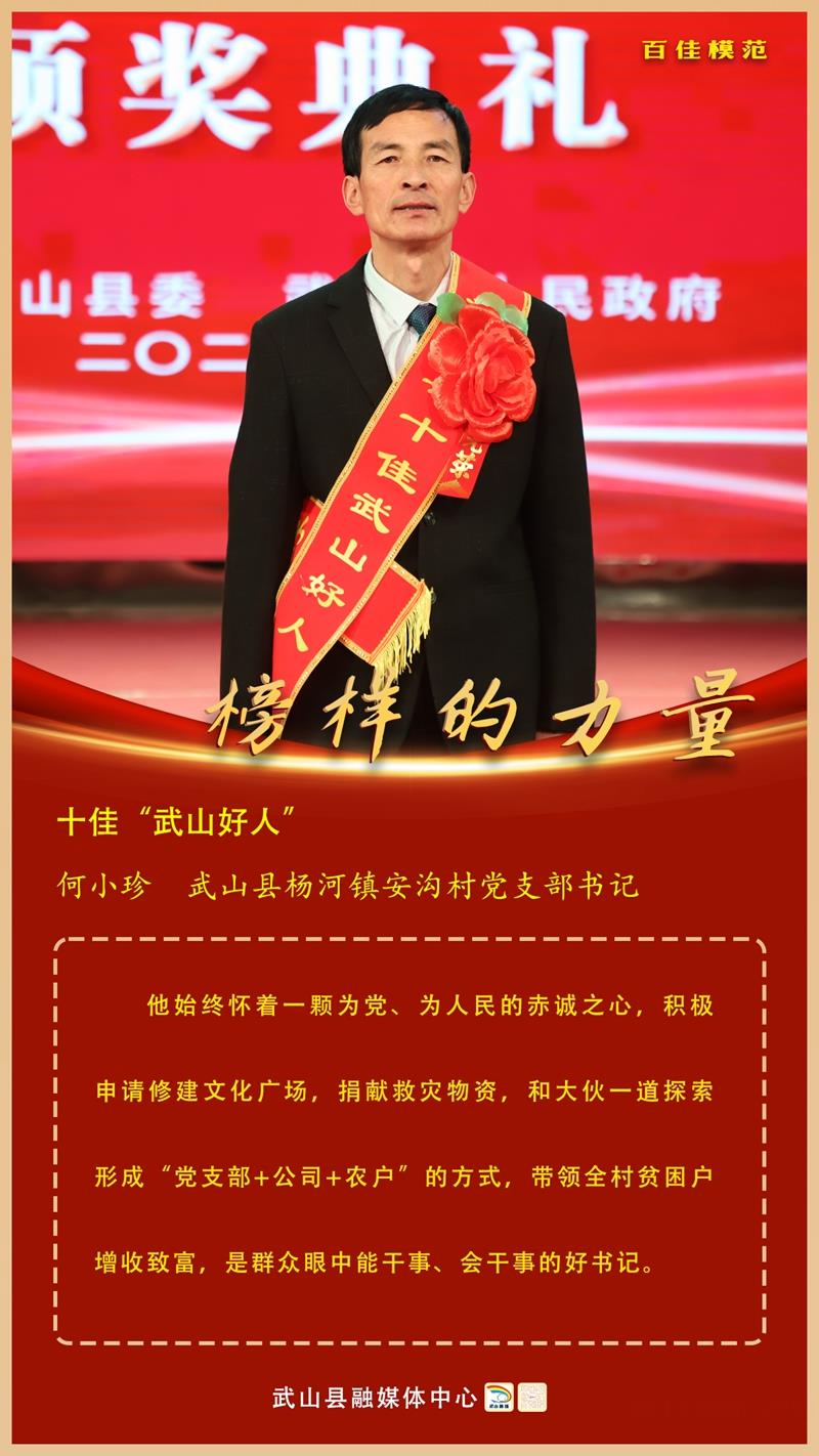 何小珍,武山縣楊河鎮(zhèn)安溝村黨支部書記。他始終懷著一顆為黨、為人民的赤誠之心,積極申請修建文化廣場,捐獻(xiàn)救災(zāi)物資,和大伙一道探索形成“黨支部+公司+農(nóng)戶”的方式,帶領(lǐng)村民增收致富,是群眾眼中能干事、會干事的好書記。