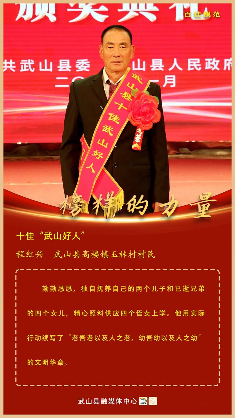 程紅興,武山縣高樓鎮(zhèn)玉林村村民。 勤勤懇懇,獨(dú)自撫養(yǎng)自己的兩個兒子和已逝兄弟的四個女兒,精心照料供應(yīng)四個侄女上學(xué)。他用實際行動續(xù)寫了“老吾老以及人之老,幼吾幼以及人之幼”的文明華章。