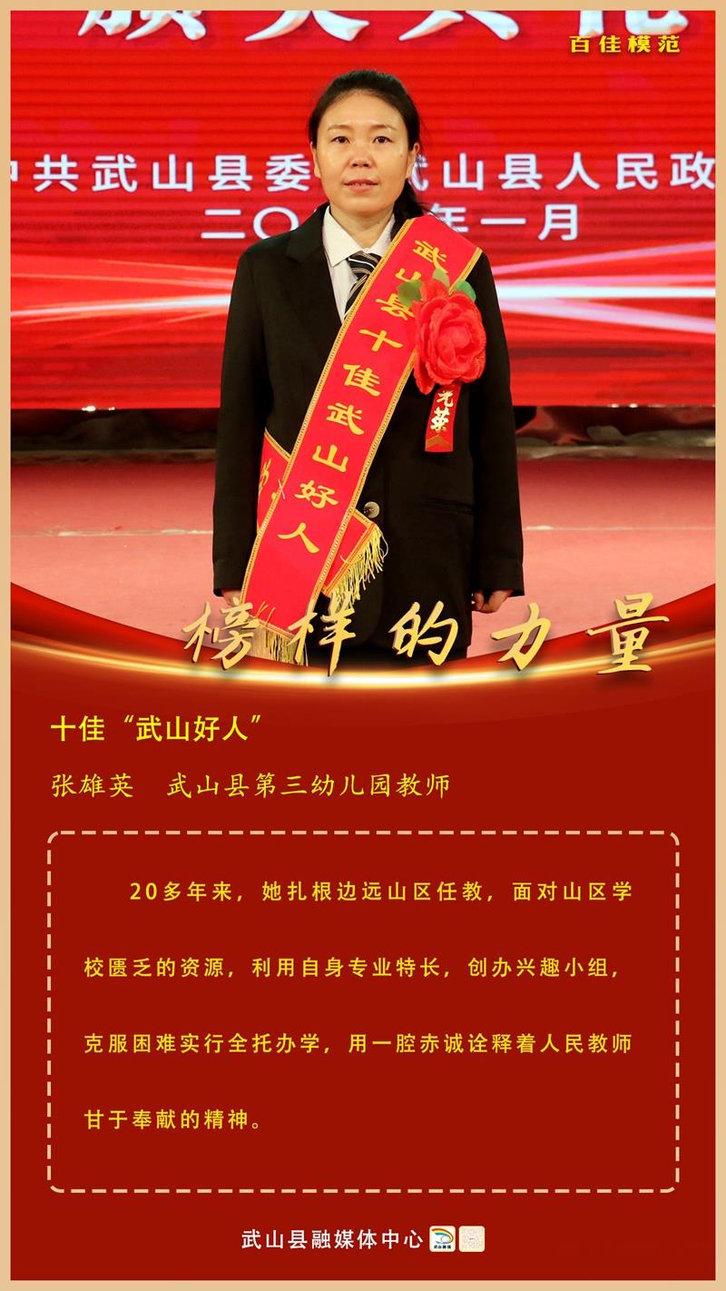 張雄英,武山縣第三幼兒園教師。20多年來,她扎根邊遠(yuǎn)山區(qū)任教,面對山區(qū)學(xué)校匱乏的資源,利用自身專業(yè)特長,創(chuàng)辦興趣小組,克服困難實行全托辦學(xué),用一腔赤誠詮釋著人民教師甘于奉獻(xiàn)的精神。