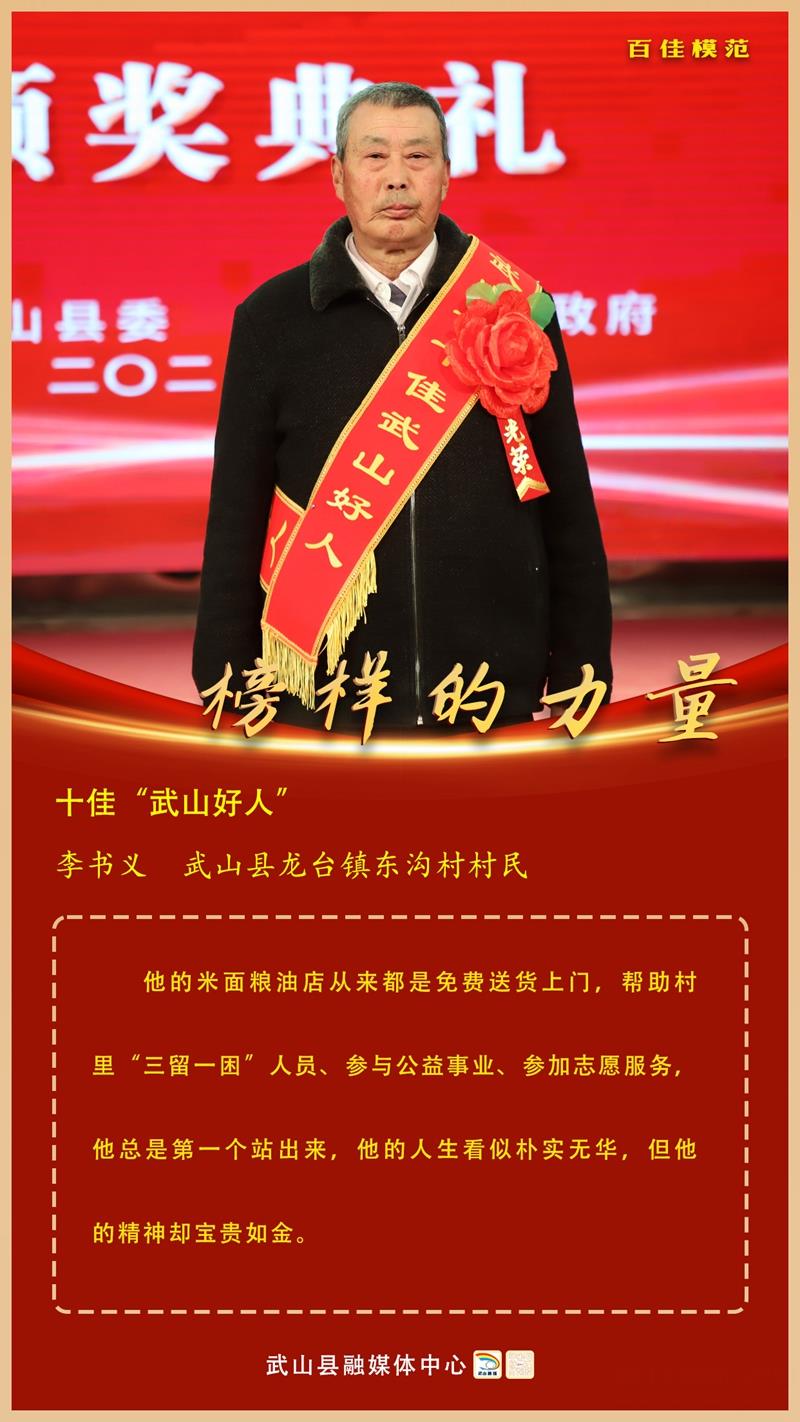 李書義,武山縣龍臺鎮(zhèn)東溝村村民。他的米面糧油店從來都是免費(fèi)送貨上門,幫助村里“三留一困”人員、參與公益事業(yè)、參加志愿服務(wù),他總是第一個站出來,他的人生看似樸實無華,但他的精神卻寶貴如金。