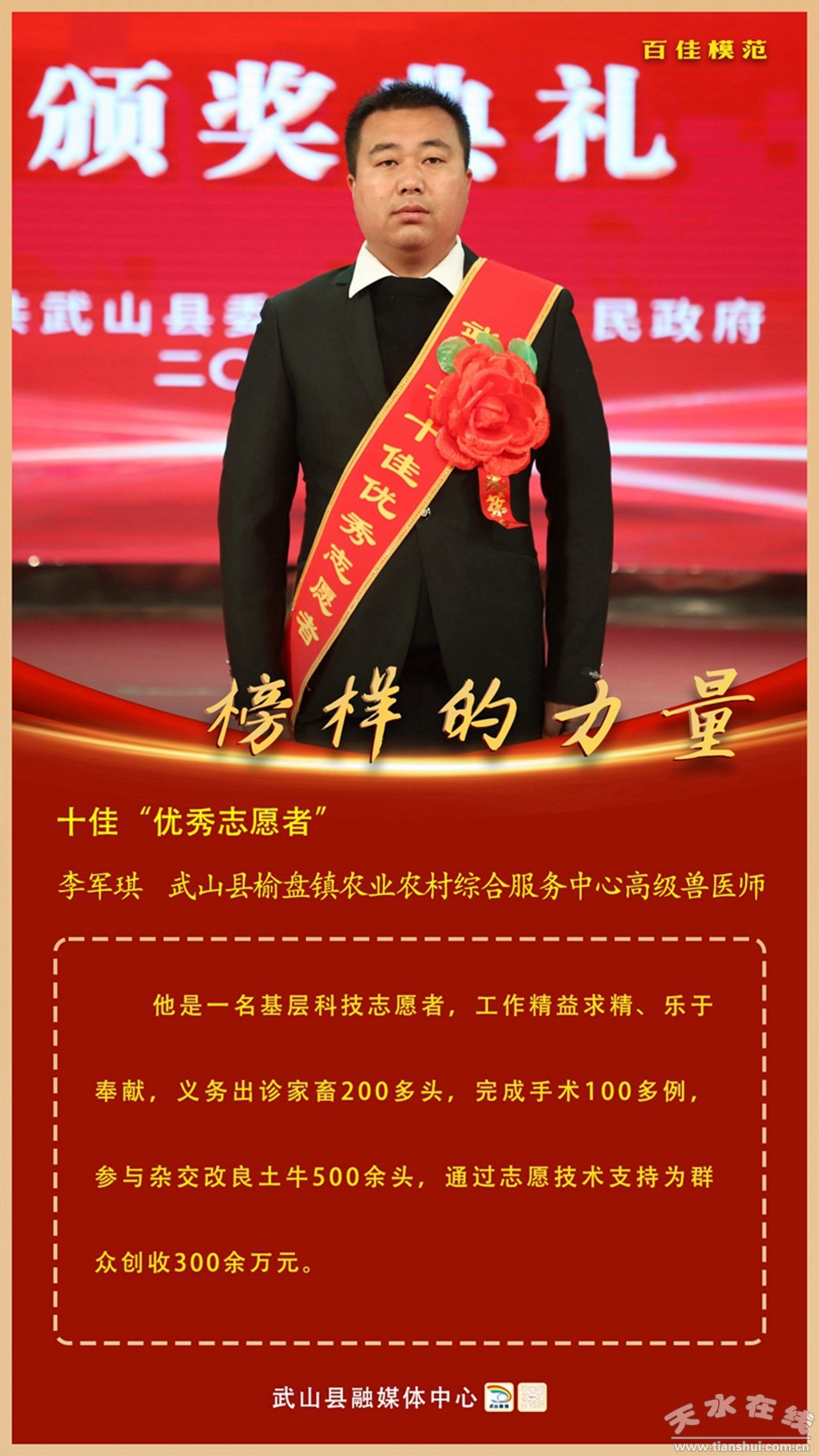 李軍琪,武山縣榆盤鎮(zhèn)農(nóng)業(yè)農(nóng)村綜合服務中心高級獸醫(yī)師。他是一名基層科技志愿者,工作精益求精、樂于奉獻,義務出診家畜200多頭,完成手術100多例,參與雜交改良土牛500余頭,通過志愿技術支持為群眾創(chuàng)收300余萬元。
