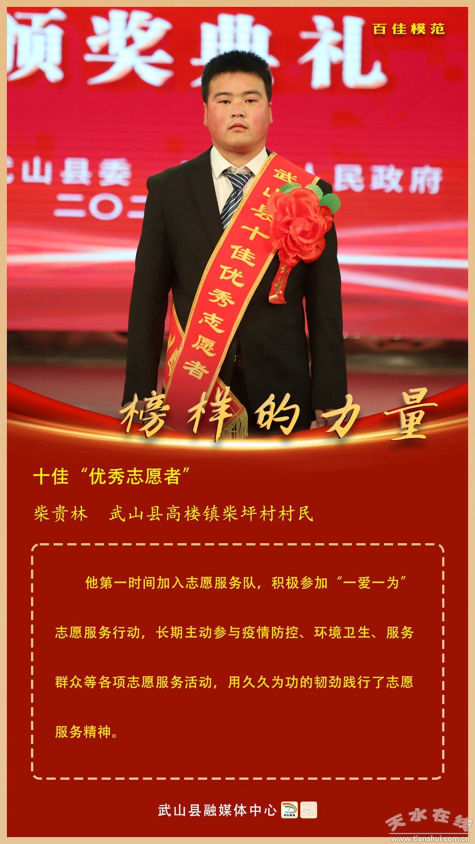 柴貴林,武山縣高樓鎮(zhèn)柴坪村村民。他第一時間加入志愿服務隊,積極參加“一愛一為”志愿服務行動,長期主動參與疫情防控、環(huán)境衛(wèi)生、服務群眾等各項志愿服務活動,用久久為功的韌勁踐行了志愿服務精神。