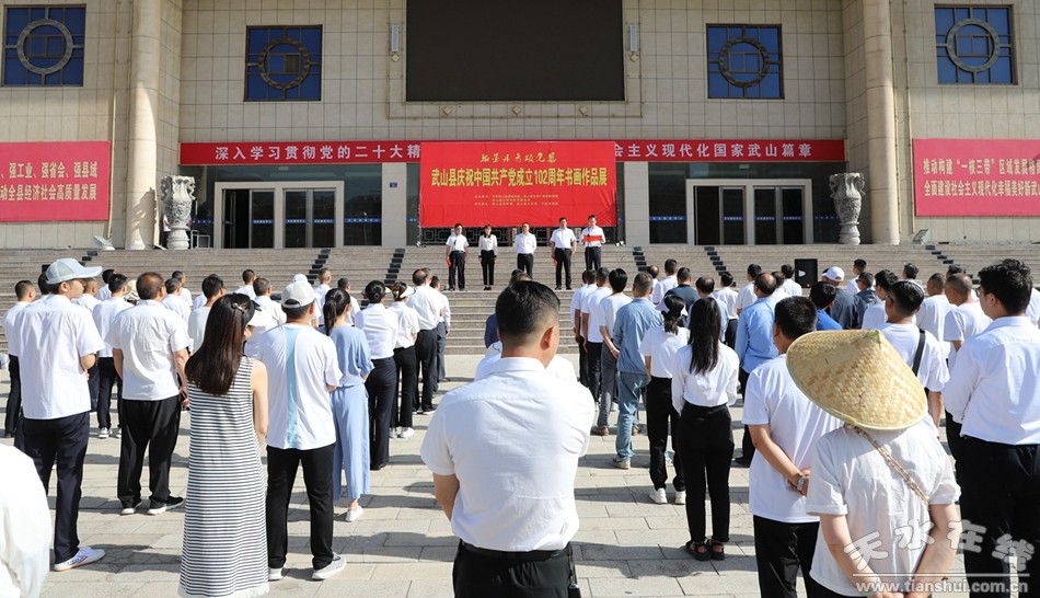 趙百祥在致辭中說,102年披荊斬棘,102年風(fēng)雨兼程。在波瀾壯闊的百年歷史進(jìn)程中,武山縣發(fā)生了翻天覆地的變化,黨的建設(shè)持續(xù)加強(qiáng),經(jīng)濟(jì)實(shí)力顯著提升,民生福祉不斷改善,群眾生活水平穩(wěn)步提高,文藝事業(yè)更是發(fā)展迅速。在歷屆領(lǐng)導(dǎo)班子的高度重視和廣大文藝工作者的潛心創(chuàng)作下,不同文藝領(lǐng)域、不同藝術(shù)門類千帆競(jìng)發(fā)、爭(zhēng)奇斗艷,特別是書畫藝術(shù)事業(yè)蓬勃發(fā)展、人才輩出,中書協(xié)、中美協(xié)會(huì)員26人,省、市、縣書協(xié)會(huì)員876人,各種書畫名作層出不窮,武山也因此被譽(yù)為“中國(guó)民間文化藝術(shù)(書畫)之鄉(xiāng)”,書畫藝術(shù)已成為武山的一張亮麗名片。希望全縣各級(jí)黨組織以此次書畫展為契機(jī),認(rèn)真學(xué)習(xí)貫徹習(xí)近平新時(shí)代中國(guó)特色社會(huì)主義思想,以文化人凝聚共識(shí),深入挖掘渭川文化底蘊(yùn),持續(xù)加強(qiáng)文藝隊(duì)伍建設(shè)。希望廣大文藝工作者深入生活、扎根人民,創(chuàng)作出更多弘揚(yáng)黨的優(yōu)秀傳統(tǒng)、謳歌黨的豐功偉績(jī)的優(yōu)秀作品,進(jìn)一步彰顯文化自信,書寫時(shí)代華章,為建設(shè)幸福美好現(xiàn)代化新武山作出新的更大貢獻(xiàn)。
