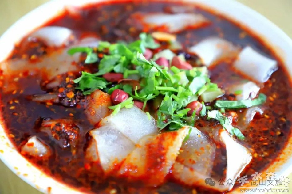 武山瓤皮,一碗黃亮透明的大寬瓤皮,加上各味調(diào)味料,配菜鮮香,辣子紅艷,色艷味美、酸辣爽口,最是撫慰人心。