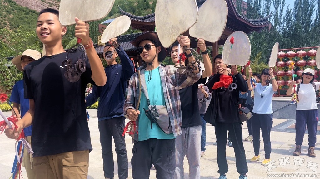 研學(xué)團(tuán)在水簾洞景區(qū)親身體驗(yàn)了國家級(jí)非物質(zhì)文化遺產(chǎn)保護(hù)項(xiàng)目武山旋鼓舞和搗蒜罐。看到世界第一摩崖大佛拉梢寺后,同學(xué)們無不為“十有武山祈福圣地”的奇山秀水和深厚文化所震撼,對(duì)世界第一摩崖大佛和拉梢寺雄渾瑰麗的壁畫彩塑和浮雕大為贊賞。