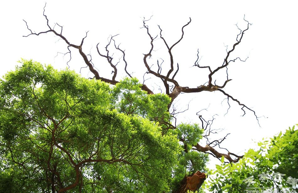 走近這棵古槐,最為震撼的便是它“枯榮共生”的奇特景象。粗壯的樹(shù)干上,一邊是郁郁蔥蔥的綠葉,在陽(yáng)光的照耀下閃爍著生機(jī)與活力,那層層疊疊的翠綠,仿佛在訴說(shuō)著生命的蓬勃與熱烈;而另一邊,則是干枯的枝丫,扭曲而滄桑,它們?cè)跁r(shí)光的侵蝕下失去了翠綠的衣裳,只剩下嶙峋的輪廓,似在默默追憶往昔歲月。一邊是新生命的不斷萌發(fā),一邊是舊時(shí)光的沉沉落幕,綠葉與枯枝形成了強(qiáng)烈的視覺(jué)對(duì)比,既讓人感受到生命的頑強(qiáng)不息,又讓人感慨歲月的無(wú)情流逝。