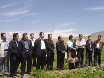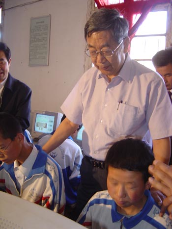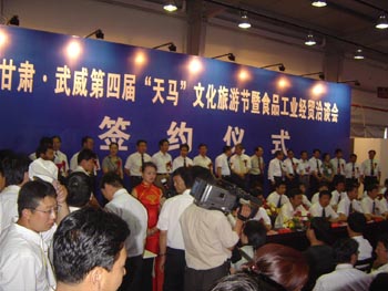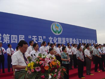 7月4日全國人大許嘉璐副委員長視察甘肅武威市。出席第四屆“天馬”文化旅游節(jié)暨食品工業(yè)經(jīng)貿(mào)洽談會,并在甘肅省河西走廊星火產(chǎn)業(yè)帶建設(shè)論壇會議上做重要指示。(中新社記者/潘克明)
