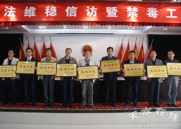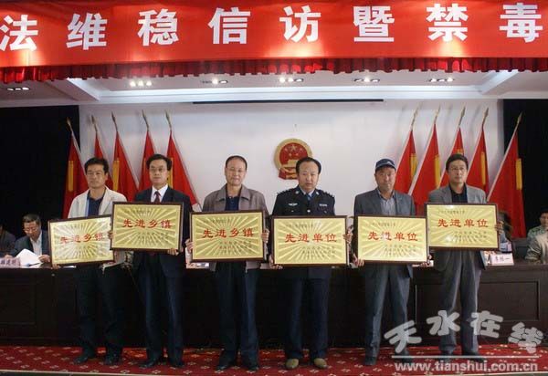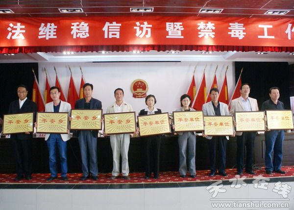 會(huì)上,縣委副書(shū)記馬正業(yè)宣讀了縣委、縣政府《關(guān)于表彰獎(jiǎng)勵(lì)2008年度綜治禁毒工作先進(jìn)單位和命名平安單位的決定》;表彰獎(jiǎng)勵(lì)了2008年度綜治、禁毒工作先進(jìn)集體,命名“平安鄉(xiāng)鎮(zhèn)”、“平安單位”及“平安村”、“平安校園”和“平安清真寺”;縣委書(shū)記蒲軍做了重要講話。張川鎮(zhèn)、龍山鎮(zhèn)、川王鄉(xiāng)、閆家鄉(xiāng)、梁山鄉(xiāng)、公安局、衛(wèi)生局、民族宗教局、電力局、發(fā)改局榮獲“2008年度全縣社會(huì)治安綜合治理工作先進(jìn)集體”獎(jiǎng);張川鎮(zhèn)、龍山鎮(zhèn)、閆家鄉(xiāng)、公安局、縣總工會(huì)、廣播電影電視局榮獲“2008年度禁毒工作先進(jìn)集體”獎(jiǎng);馬鹿鄉(xiāng)、木河鄉(xiāng)、馬關(guān)鄉(xiāng)、平安鄉(xiāng)、國(guó)土局、司法局、環(huán)保局、招商局、縣人行被命名為2008年度“平安鄉(xiāng)鎮(zhèn)”、“平安單位”稱(chēng)號(hào);張川鎮(zhèn)東關(guān)村等37個(gè)村被命名為“平安村”稱(chēng)號(hào);縣三中等5所中小學(xué)校被命名為“平安校園”稱(chēng)號(hào);張川鎮(zhèn)東關(guān)清真寺等5處清真寺被命名為“平安清真寺”稱(chēng)號(hào)?h委書(shū)記蒲軍做了重要講話。