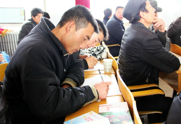 12月27日,楊寬心等來(lái)了甘肅農(nóng)業(yè)大學(xué)培訓(xùn)中心副主任、繼續(xù)教育學(xué)院黨總支書(shū)記黃成定一行。在大陽(yáng)鄉(xiāng)大陽(yáng)中學(xué)禮堂,楊寬心和鄉(xiāng)里的160多名果農(nóng)一起,聆聽(tīng)了甘肅農(nóng)業(yè)大學(xué)農(nóng)學(xué)院副院長(zhǎng)陳佰鴻教授、草業(yè)學(xué)院王森山教授、草業(yè)學(xué)院李惠霞副教授的精彩講課。課堂上,他又是聽(tīng),又是寫(xiě),時(shí)而點(diǎn)頭,時(shí)而又搖頭,注意力完全被教授們充分準(zhǔn)備的PPT課件內(nèi)容中新穎而又實(shí)用的蘋(píng)果生產(chǎn)技術(shù)和農(nóng)作物病蟲(chóng)害防御知識(shí)所吸引。