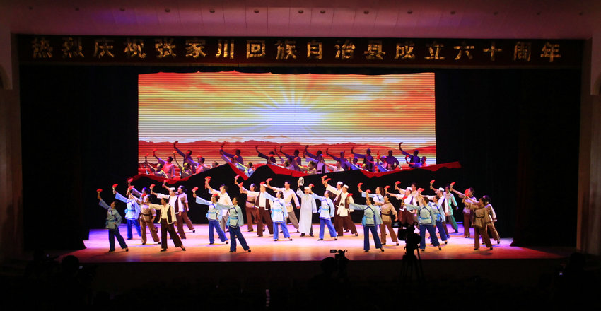 據(jù)了解,張家川縣音樂舞蹈劇《關(guān)山月》以“回漢團(tuán)結(jié)一心,共建和諧家園”為主題,用舞臺藝術(shù)再現(xiàn)了回族從清朝末年流落關(guān)山腳下到今天建成幸福家園的百余年發(fā)展史,全景式反映了全國民族團(tuán)結(jié)進(jìn)步縣張家川經(jīng)濟(jì)繁榮、文化發(fā)展、社會進(jìn)步的和諧局面。全劇以“月”的陰晴圓缺象征張家川回族近百年的歷程,以歷史時間為脈絡(luò)結(jié)構(gòu)劇本,由序曲《月彎彎》,主體《關(guān)山殘月》、《關(guān)山古月》、《關(guān)山新月》、《關(guān)山明月》、《關(guān)山圓月》五個篇章,尾聲《感恩香茶》等部分組成,融原生態(tài)花兒、民謠、原創(chuàng)詩朗誦、原創(chuàng)歌舞等多種藝術(shù)元素為一體。