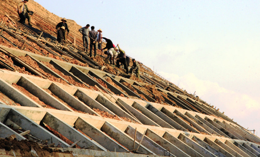 施工方負(fù)責(zé)人表示,周家大莊段坡面土體松散破碎,施工難度大,作業(yè)環(huán)境危險(xiǎn)。施工單位將認(rèn)真按照“查明情況,綜合治理,力求根治,不留后患”的原則,結(jié)合滑坡形成的內(nèi)外部條件,采用預(yù)應(yīng)力錨索框架梁支擋、重力式擋墻支護(hù)的措施,并輔以?huà)炀W(wǎng)錨噴及坡面綠化和截排水設(shè)施等進(jìn)行治理。目前正在進(jìn)行一級(jí)坡?lián)鯄、拱形骨架和直線(xiàn)高度50米的四級(jí)坡錨索框架澆注。