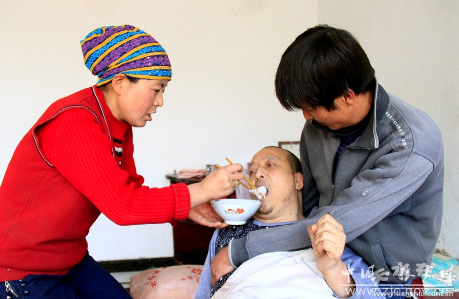 ▲11月19日,王麻、王杏曼夫妻給王麻的大哥王振宇喂飯。王振宇因意外癱瘓臥床26年,吃喝拉撒全靠王麻夫妻照顧
