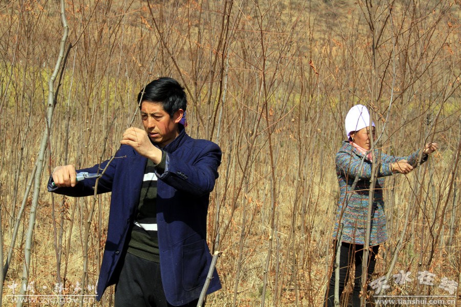 2月16日,馬鹿鎮(zhèn)大灘村村民馬啟明在刺槐苗地里修剪樹苗。