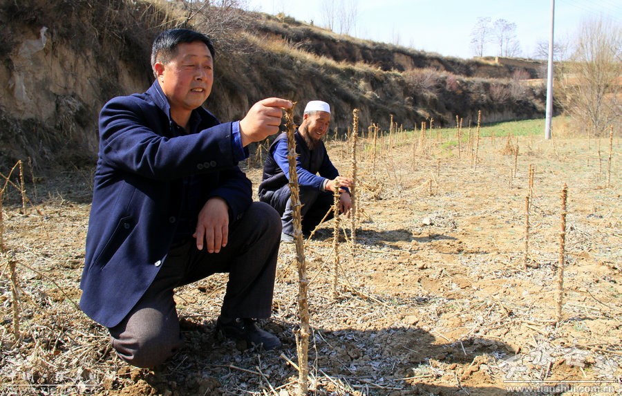 4月4日劉堡鎮(zhèn)窯兒村黨支部書(shū)記馬甲平和村民在一塊生長(zhǎng)了1年的烏龍頭地里查看長(zhǎng)勢(shì)