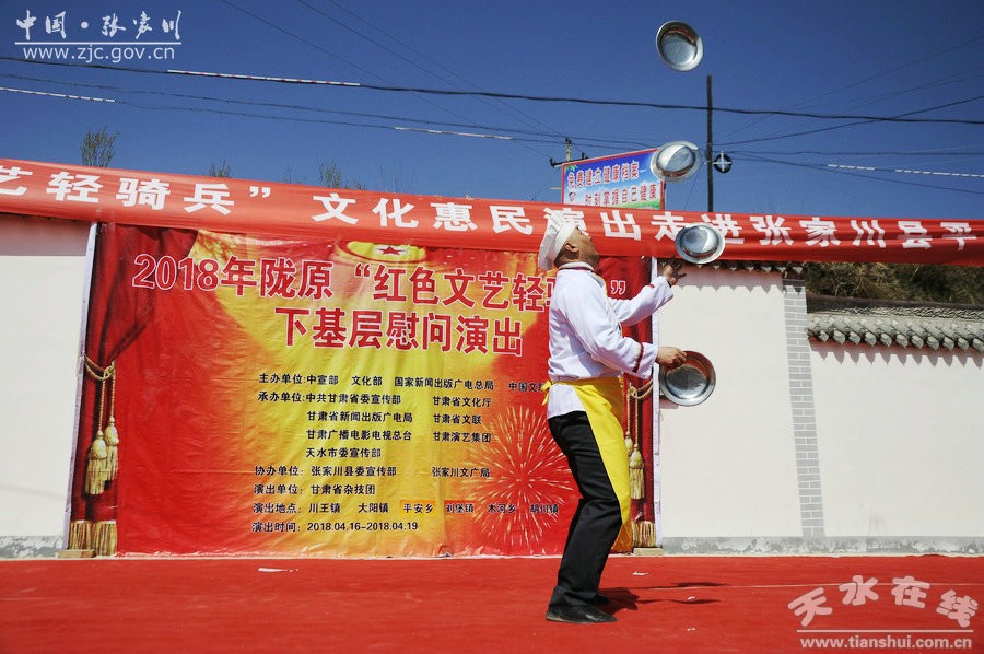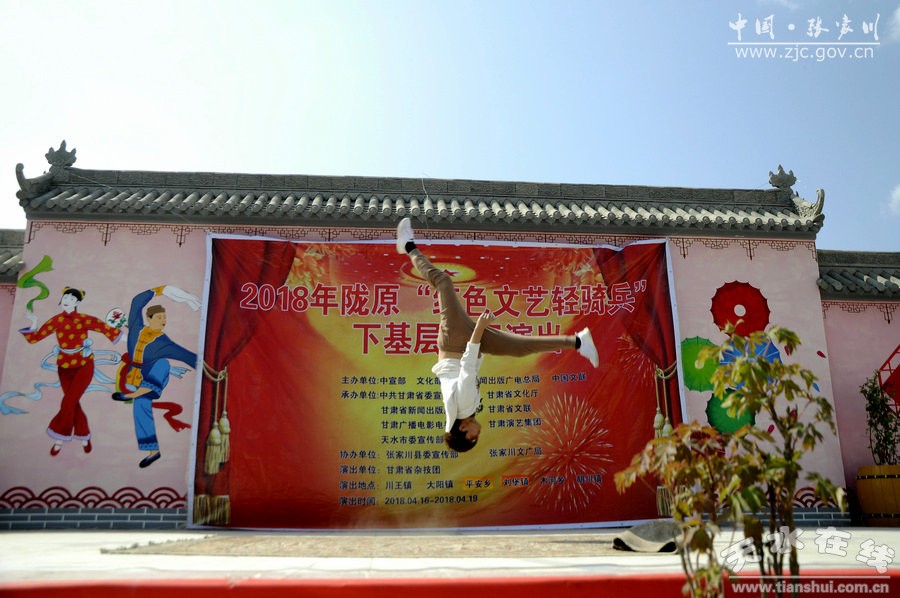 4月16日至19日,由中宣部、文化部、國家新聞出版廣電總局、中國文聯(lián)主辦,甘肅省委宣傳部、省文化廳、省新聞出版廣電局、省文聯(lián)、省廣播電影電視總臺、省演藝集團(tuán)、天水市委宣傳部承辦,張家川縣委宣傳部、縣文廣局協(xié)辦,甘肅省雜技團(tuán)做為演出單位組織實施的隴原“紅色文藝輕騎兵”文化惠民演出活動走進(jìn)張家川縣,深入川王、平安、劉堡、胡川等鄉(xiāng)鎮(zhèn)為廣大回漢群眾送去了文化的春風(fēng),把黨的十九大精神送到了老百姓的心坎上,受到了群眾的熱烈好評和稱贊。