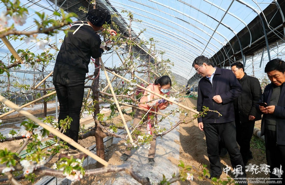 人勤春來早,立春后的馬河村農(nóng)業(yè)示范園里,一派繁忙的勞動(dòng)景象。裕豐果品種植合作社的現(xiàn)代化溫室大棚里,潔白的櫻桃花競相綻放,果農(nóng)們正忙著給果樹疏花授粉!敖衲炅⒋禾鞖夂,光照充足,大棚櫻桃長勢好,我們的大櫻桃開花早,估計(jì)3月底到4月初上市。”合作社負(fù)責(zé)人介紹,為保證大櫻桃盡早上市,春節(jié)期間外地員工就地過年,合作社已做好了各項(xiàng)保障工作。陳晰走進(jìn)櫻桃大棚,察看果樹長勢和授粉情況,詢問合作社就地吸納用工等工作。他希望合作社在統(tǒng)籌常態(tài)化疫情防控的基礎(chǔ)上,不誤農(nóng)時(shí)、抓好生產(chǎn),科學(xué)做好果樹管護(hù)和田間管理,保證上市的大櫻桃果品質(zhì)優(yōu)。