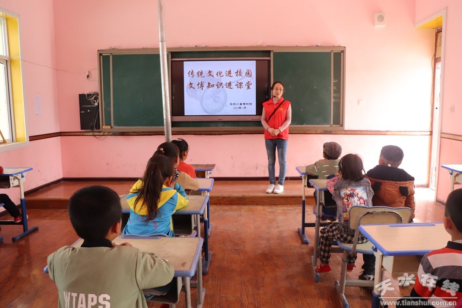 講解員將文博知識(shí)帶進(jìn)課堂,讓同學(xué)們了解張家川縣悠久歷史文化和馬家塬獨(dú)特的西戎文化。通過PPT課件向?qū)W生們介紹清明節(jié)的來源、習(xí)俗,國(guó)!逗佑灐纺ρ率、畫像磚的知識(shí)以及拓片的制作過程。