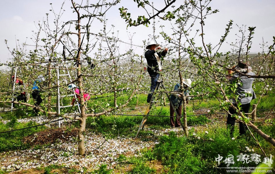 近日,記者走進(jìn)馬河村現(xiàn)代農(nóng)業(yè)示范園榮達(dá)農(nóng)民種植專業(yè)合作社時,這里風(fēng)景如畫、花開正盛,果園里除了嗡嗡飛舞的蜜蜂,還有穿梭在果樹中間,忙著疏花、澆灌的農(nóng)民。