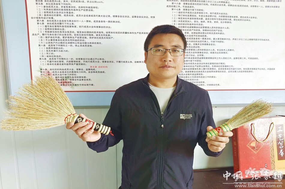 “綠興農(nóng)民專業(yè)合作社現(xiàn)帶動就業(yè)32人,主要以笤帚加工業(yè)為主。我們的笤帚有掃地的、刷鍋的、工藝品性質(zhì)的都有,還可以生產(chǎn)多種不同用途的笤帚。目前,笤帚產(chǎn)品年產(chǎn)值在12萬元左右,笤帚加工生產(chǎn)已成為鄉(xiāng)村振興的支柱產(chǎn)業(yè)之一。”展示柜前黨支書書記趙小剛介紹了產(chǎn)業(yè)發(fā)展情況。