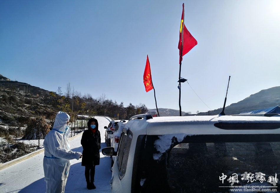 在馬塬村疫情監(jiān)測點,道路被大雪覆蓋,堅守在疫情防控一線的工作人員全身花白,在滿天飛舞的大雪中仍然像往常一樣對過往車輛和人員進行檢測!捌桨侧l(xiāng)雖然海拔高,天氣冷,但不論白天黑夜,不論風雪有多厲害,我們都會堅守崗位,每個環(huán)節(jié)都不會因為天氣原因而有半點馬虎!逼桨侧l(xiāng)紀委副書記王建剛這樣說道。