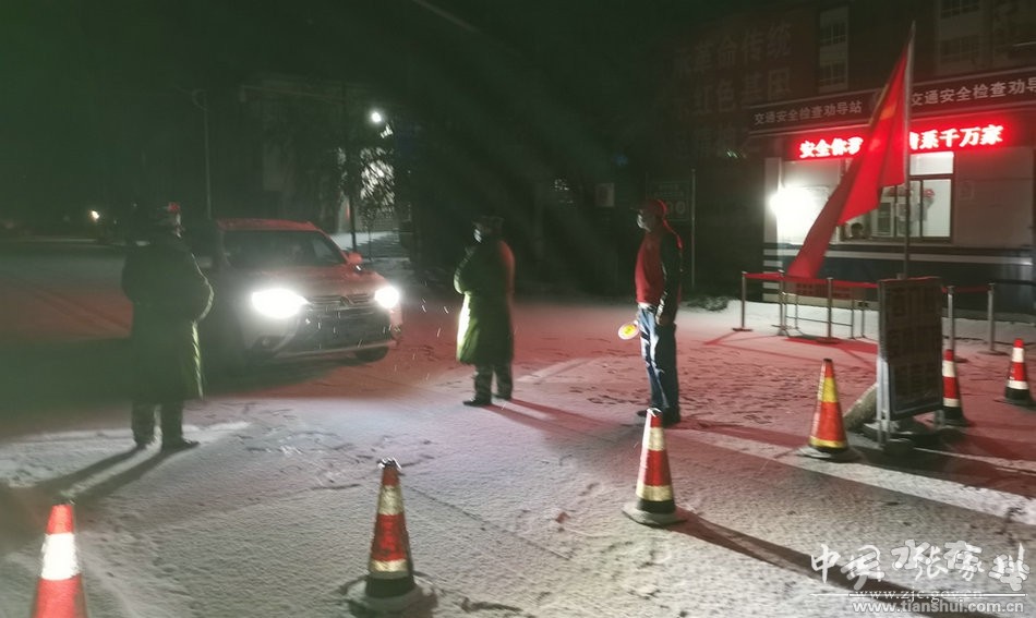 在縣二幼十字,漫天飛舞的大雪在路燈下分外妖嬈,風(fēng)雪中,值班民警戴著執(zhí)勤紅袖章分列卡口兩側(cè),一邊不斷拍打著掉落在臉上、衣服上的雪花,一邊為過往人員進(jìn)行檢測,并耐心提醒過往群眾天冷路滑、一定注意安全,沒事少出門,必須出門時一定要佩戴口罩,做好自身防護(hù)。