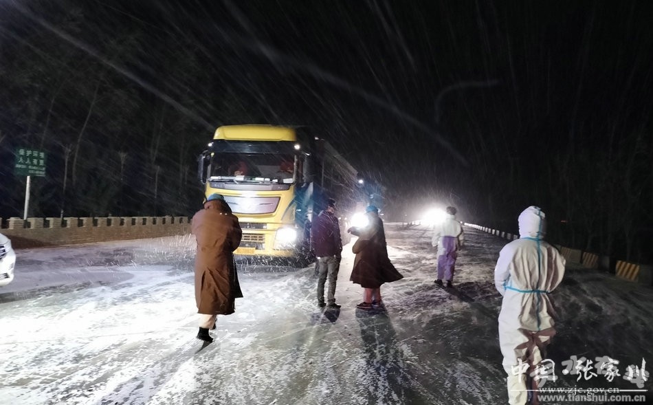 11月6日,受風(fēng)雪天氣影響,全縣境內(nèi)道路出現(xiàn)大面積結(jié)冰,胡川鎮(zhèn)疫情防控卡點(diǎn)上的黨員干部、志愿者們沒(méi)有退縮,做好防護(hù)按時(shí)交接換班后,繼續(xù)堅(jiān)守疫情防控卡點(diǎn)。晚上8點(diǎn)接到全縣因惡劣天氣執(zhí)行臨時(shí)交通管制的通知后,胡川鎮(zhèn)第一時(shí)間封閉道路。風(fēng)雪天冷人情暖,疫情無(wú)情人有情,疫情防控點(diǎn)的黨員干部集體為滯留的大型運(yùn)輸車(chē)輛司機(jī)師傅送去熱水、泡面、棉服,和他們一起共克時(shí)艱,共抗疫情。