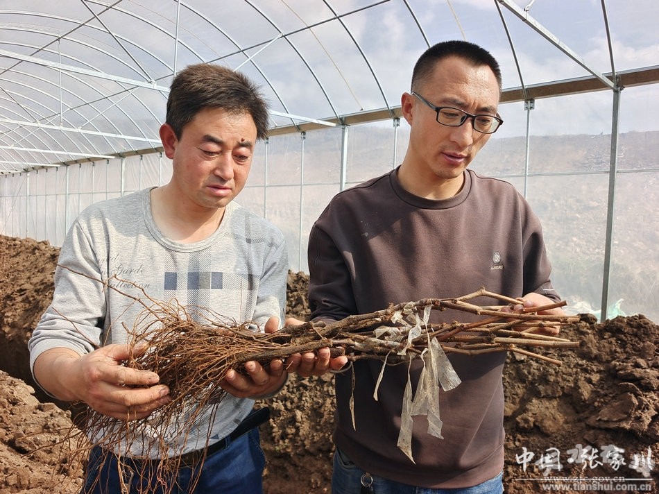 看到馬達(dá)村書記馬錦民與公司負(fù)責(zé)人楊建剛觀察著陽光玫瑰葡萄苗,我們的記者也過去一探究竟。