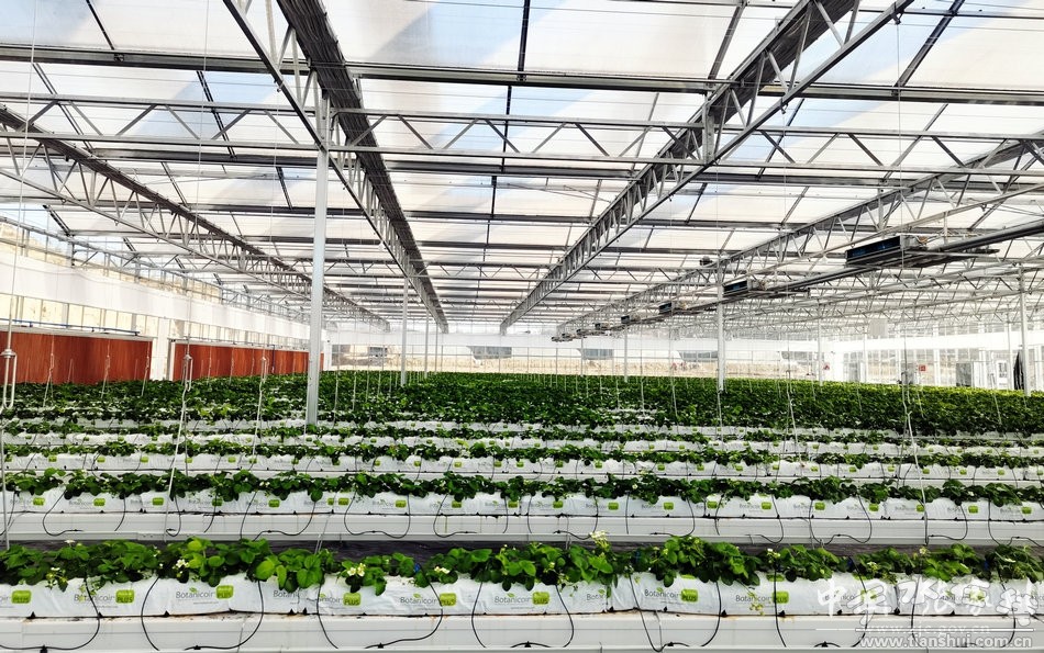 在產(chǎn)業(yè)園的溫室里,草莓苗被整整齊齊地種植在一排排立架上,棚內(nèi)有溫濕度監(jiān)測(cè),空氣中彌漫著淡淡的清香。放眼望去,綠葉掩映下的枝干上開滿了白色小花,有的草莓花瓣剛剛褪去,有的已經(jīng)開始泛白,也有的已經(jīng)綠中泛紅,還有部分即將成熟的草莓倒掛下來(lái),長(zhǎng)勢(shì)喜人。