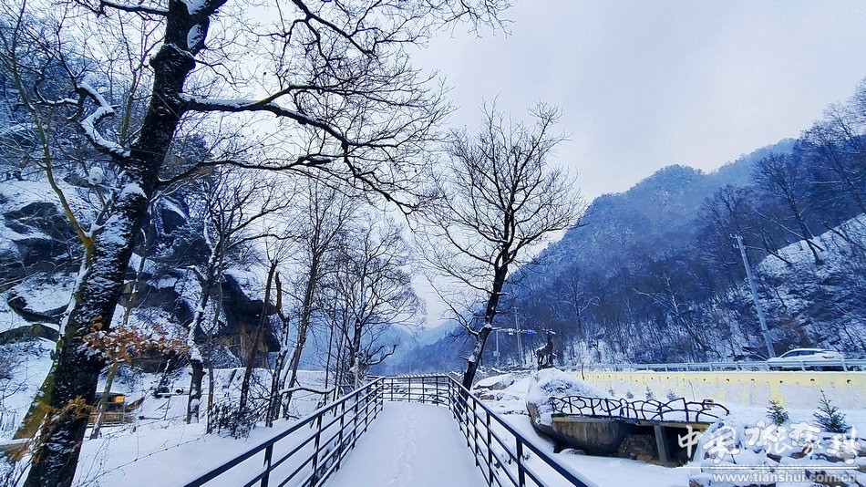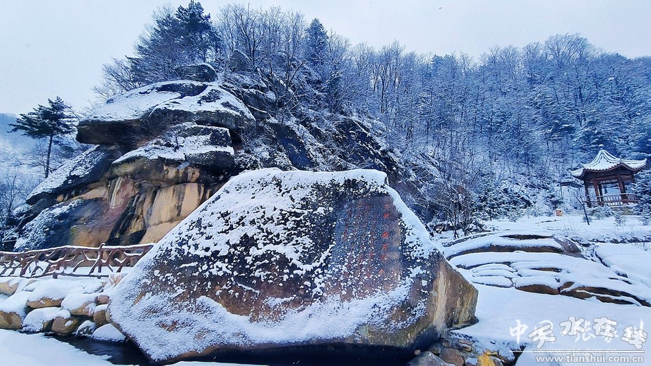 古道亭臺、煥發(fā)新顏,毗鄰關(guān)山的花園村,新建的亭臺欄桿被覆蓋上了一層厚厚的積雪,將這座絲綢古道邊的小村莊襯托得更加美麗,一旁雄奇的太極八卦石,不禁引人產(chǎn)生無限遐想。