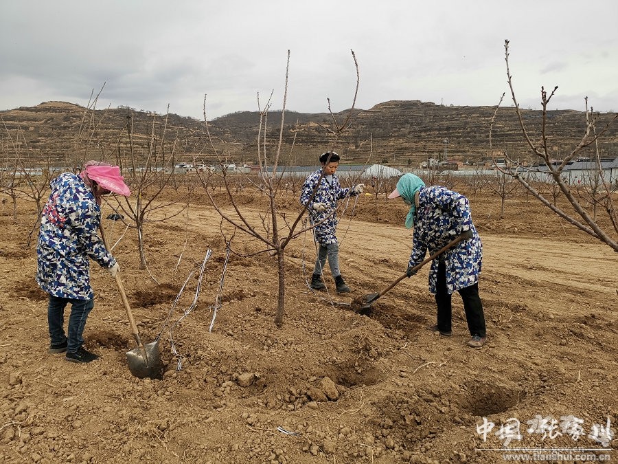 3月28日,記者走進(jìn)位于張家川鎮(zhèn)劉家村的張家川縣現(xiàn)代果業(yè)產(chǎn)業(yè)園,在室外培育基地,果農(nóng)們手握鐵鍬,在一棵棵櫻桃樹前圍堰培土澆水拉枝整形。