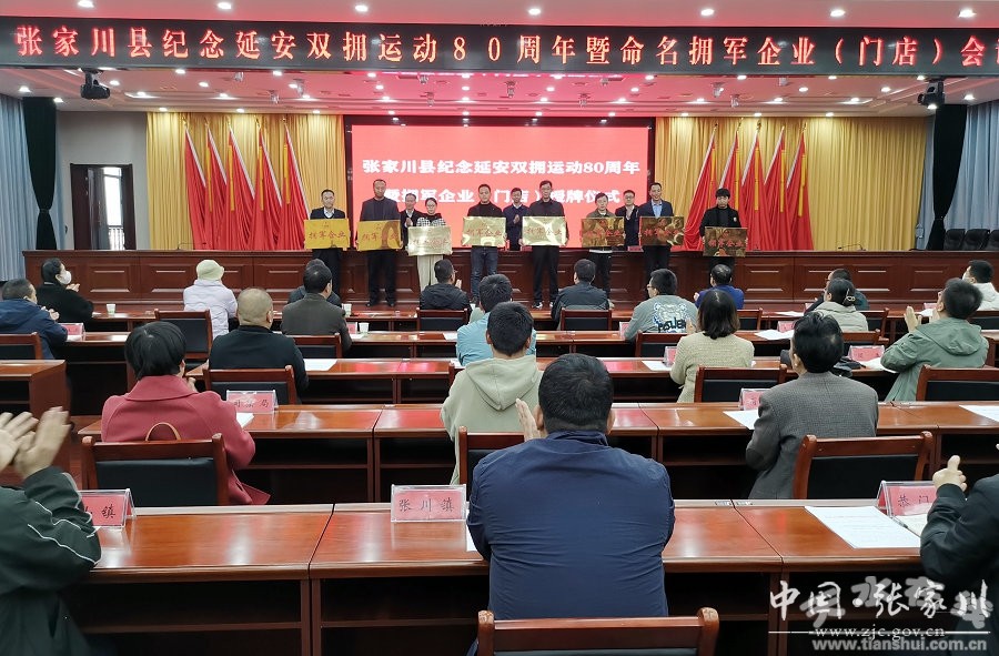 會(huì)議宣讀了《張家川縣雙擁工作領(lǐng)導(dǎo)小組辦公室關(guān)于命名天水嘉茂建筑工程有限公司等十四家擁軍企業(yè)(門(mén)店)的通知》。與會(huì)領(lǐng)導(dǎo)為14家擁軍企業(yè)(門(mén)店)授牌。