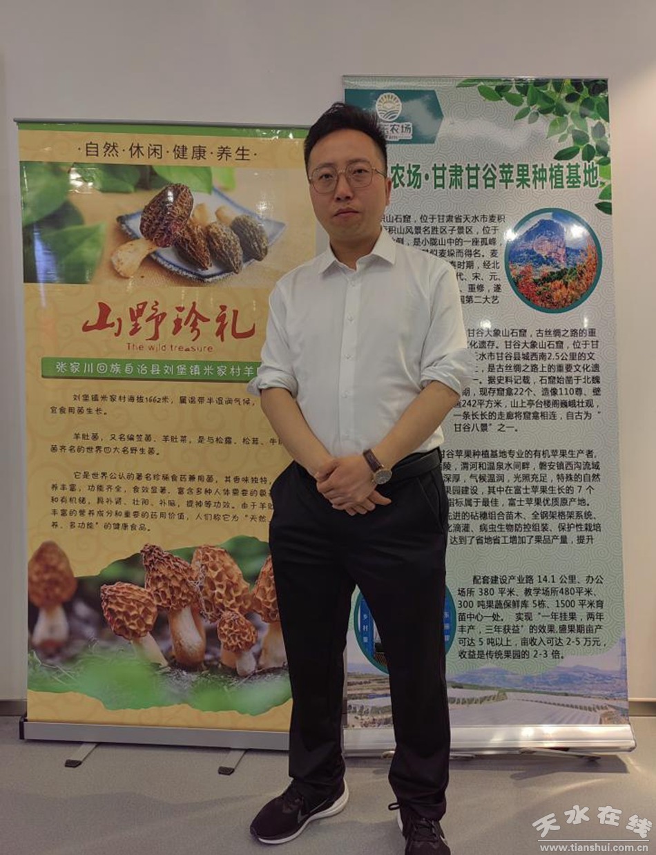 (劉堡鎮(zhèn)鎮(zhèn)長(zhǎng)何翔向京東集團(tuán)副總裁葉威、馮全普,甘肅省人大原副主任周多明,原甘肅省副秘書長(zhǎng)、省人民政府駐京辦主任劉天明,天水市政府一級(jí)巡視員逯克宗等領(lǐng)導(dǎo)推介特色農(nóng)產(chǎn)品)