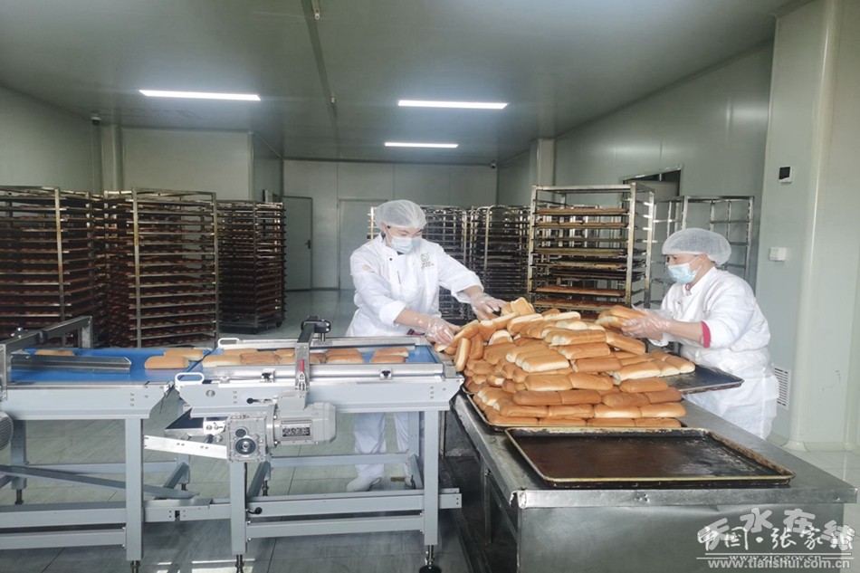 在天水星月食品有限公司生產(chǎn)車(chē)間,工人師傅在流水線上生產(chǎn)面包和天水麻辣燙等產(chǎn)品,一派繁忙景象。
