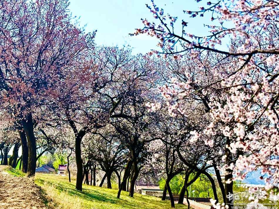 陽(yáng)洼村的溝壑間,桃花灼灼盛放,粉白相間、如云似霞,點(diǎn)綴在梁峁溝壑之間,為春日的阿陽(yáng)大地平添一抹溫柔亮色。藍(lán)天白云之下,繁花與綠野相依,遠(yuǎn)山與近景相融,移步換景皆是詩(shī)意。