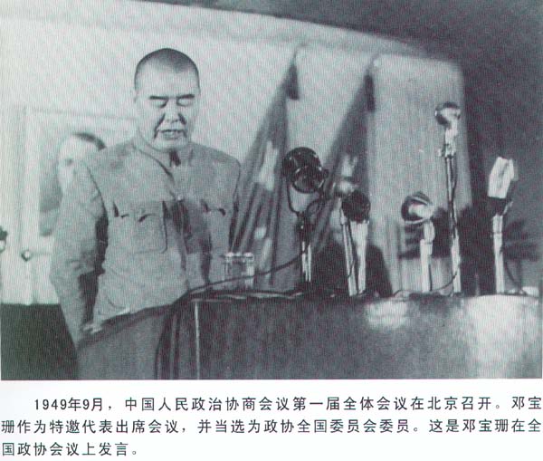 1948年4月,國民政府召開“偽國大”,鄧寶珊目睹“選舉”丑態(tài)心灰意冷,又回三原“養(yǎng)病”。8月,“華北剿總”傅作義邀鄧駐節(jié)包頭,鄧于月底飛北平,就任“副總司令”,晉升為上將。12月,傅作義接受人民解放軍的和平談判倡議,經(jīng)馬占山建議,傅以鄧寶珊和共產(chǎn)黨歷史關系較深,且有威望,安排其出任談判代表。1949年1月13日,鄧寶珊由周北峰陪同,前往人民解放軍平津前線部隊駐地,與林彪、羅榮桓、聶榮臻等會談,經(jīng)過三天談判,達成和平解放北平的協(xié)議。毛澤東表示,經(jīng)鄧先生達成的協(xié)議是可行的,我們對鄧先生完全信賴。