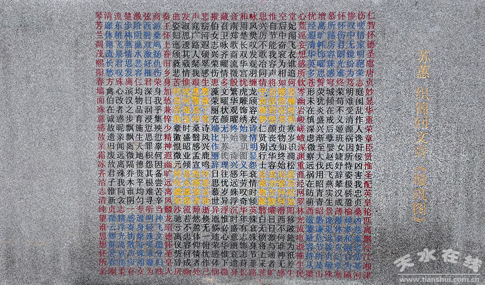 這首詩,賀知章當時一見便贊嘆不已。此詩在天寶十二年(公元753年)之前,已由唐人選入唐詩集中,《唐人選唐詩》已被大盜伯希和從敦煌藏經(jīng)窟中盜走,現(xiàn)藏倫敦大英博物館中。此詩本世紀初曾經(jīng)羅振玉先生點校,編入其《群書點勘》中。1958年12月由中華書局上海編輯所收錄所行。經(jīng)專家考證,《全唐詩》及其它唐詩收本所收此詩,應(yīng)以這本《唐人選唐詩》寫本為準。李白之詩,為蘇若蘭織錦于秦州留下了佐證。三是竇滔與蘇蕙成婚后,竇滔出任秦州刺史,蘇蕙同往,在竇滔謫戍中蘇蕙自當仍留在秦州,據(jù)此推斷,她是在秦州織成這幅回文詩的;四是《璇璣圖》中有詩:“藏摧悲聲發(fā)西秦,商弦激脆流箏蓁”。前秦都城在長安,被稱為西秦者,不可能是近在咫尺的扶風(fēng),而只會在向西的秦州。四是武則天(《璇璣圖》記)在敘述事情的結(jié)局時說“因送趙陽臺之關(guān)中,而具車從盛禮迎蘇氏,歸于漢南”?梢娞K蕙當時不在關(guān)中,而是在天水,否則武則天在文字上不會作如此記述。正因為如此,當代著名學(xué)者李實先生,在他的《回文璇璣圖》一書中,總結(jié)歷代破譯奧秘和規(guī)律,已成功破譯出詩句一萬四千余首,增添了新的文壇佳話。據(jù)他考證,得出了“蘇若蘭織錦只能是在天水,而不是別的地方。盡管從感情上講,蘇若蘭原本是他的陜西老鄉(xiāng)”。綜上所述,織錦臺遺址歸屬地應(yīng)該在今天水市秦州區(qū)。