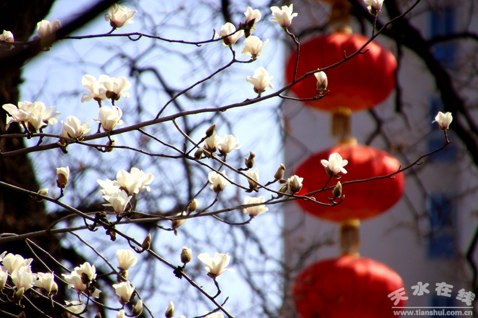 今年的春天比往年早些,天水的人們正月十五鬧完了花燈,朝完了人宗廟,緊接著便是驚蟄時節(jié)。驚蟄后,天水的天氣慢慢轉(zhuǎn)暖,城中古巷自由路的玉蘭花迫不及待地爭搶第一春的美艷,在高懸的大紅燈籠映襯下悄然開放!扒我膊粻幋海话汛簛韴蟆,梅花是大多數(shù)地方春天的信使,在天水報春的則是滿街的玉蘭花。 玉蘭花開,熱烈灑脫、酣暢淋漓、婀娜多姿、冰清玉潔,靚麗了整個古城的春天。