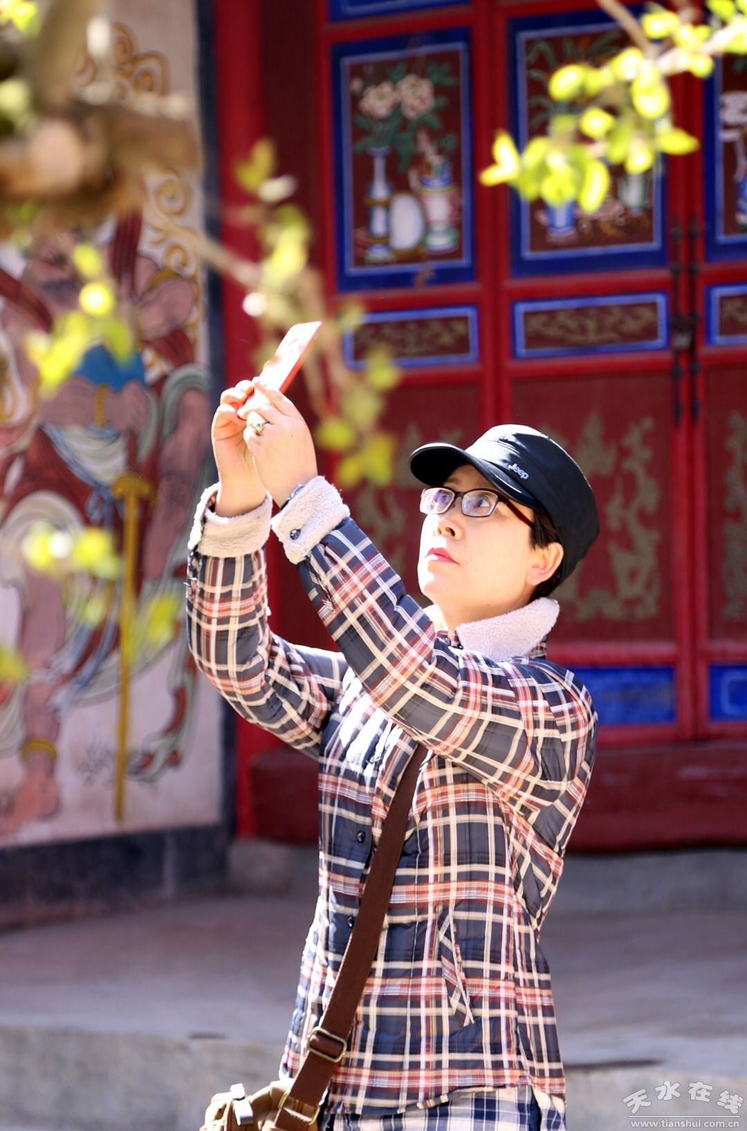 到得五臺山頂,路面開闊平整,腳下一塵不染。與連翹節(jié)相隔不過三天,一場寒潮剛過,空氣清冽,藍(lán)天如洗。山頭遠(yuǎn)眺,杏花點點,田疇如氈。穿過五臺山門,步入道觀院內(nèi),目力所及,已非數(shù)年前之所見。綠樹獨立,庭間寂寂,果然清涼之地。上了幾層臺階,但見菩薩殿旁側(cè)是一株樹齡百余年的刺槐,天梯兩旁各有一株紫丁香,聽說樹齡也過了百年,紫丁香緊挨著的,是一棵樹齡近百年的蔥皮忍冬。