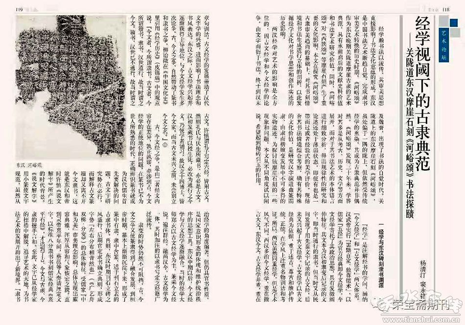 金石其堅,貞珉永志。近日,由天水學(xué)者書法家楊清汀、竇永鋒師生,合作撰寫的碑刻書法研究《經(jīng)學(xué)視閾下的古隸典范——關(guān)隴道東漢摩崖石刻<河峪頌>書法探賾》一文,在國家級藝術(shù)類核心期刊《榮寶齋》雜志,2018年第9期發(fā)表。此文是繼2018年7月,楊清汀、竇永鋒共同撰寫的《刊石壯關(guān)隴、古道照顏色——關(guān)隴道東漢摩崖石刻<河峪頌>文化價值初探》一文,在《中國書法·書學(xué)》雜志第7期推出研究專輯之后,從漢代經(jīng)學(xué)大文化背景下和古隸嬗變角度,對《河峪頌》摩崖石刻做出的最具權(quán)威和縱深度的書法文獻(xiàn)研究。