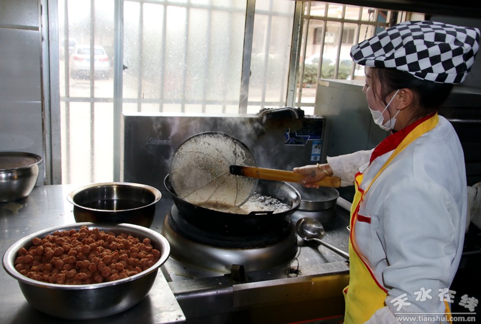 1月9日,臘月初四。天水廚藝人王婭萍的灶臺上,已經(jīng)備好了制作丸子的肉餡和調(diào)料,廚師們正在有條不紊的制作丸子。起鍋燒油,將肉餡一攪一捏一擠再拿小勺一挖一入油鍋,粉嫩嫩的肉丸子在油鍋中一翻滾就變得金黃……