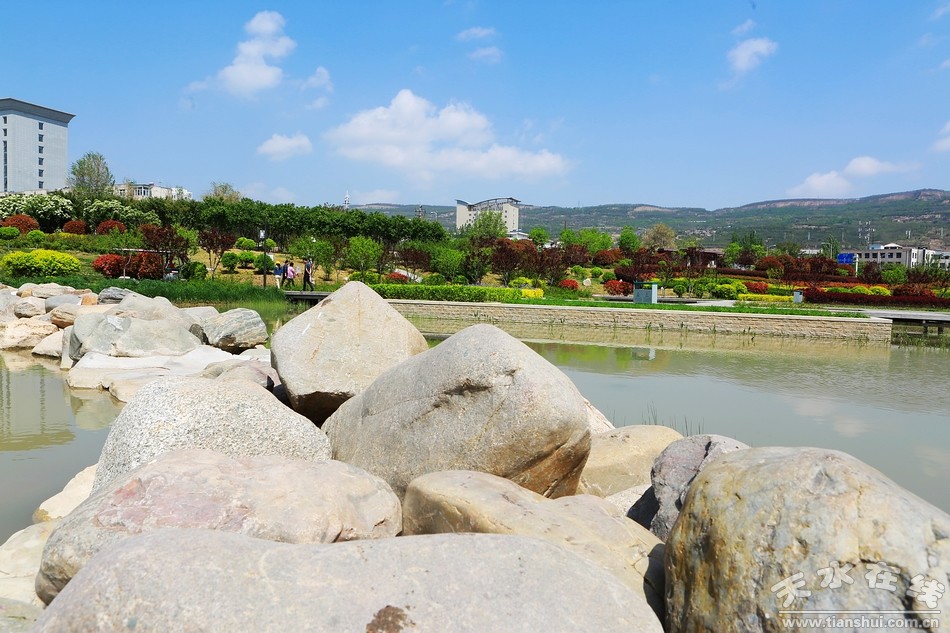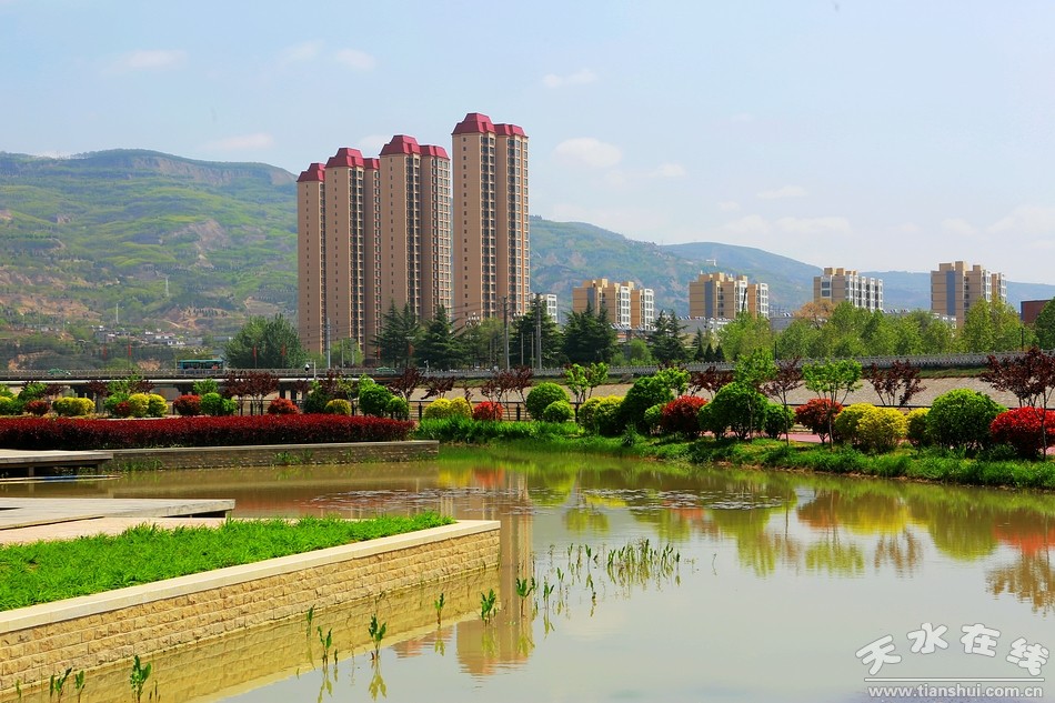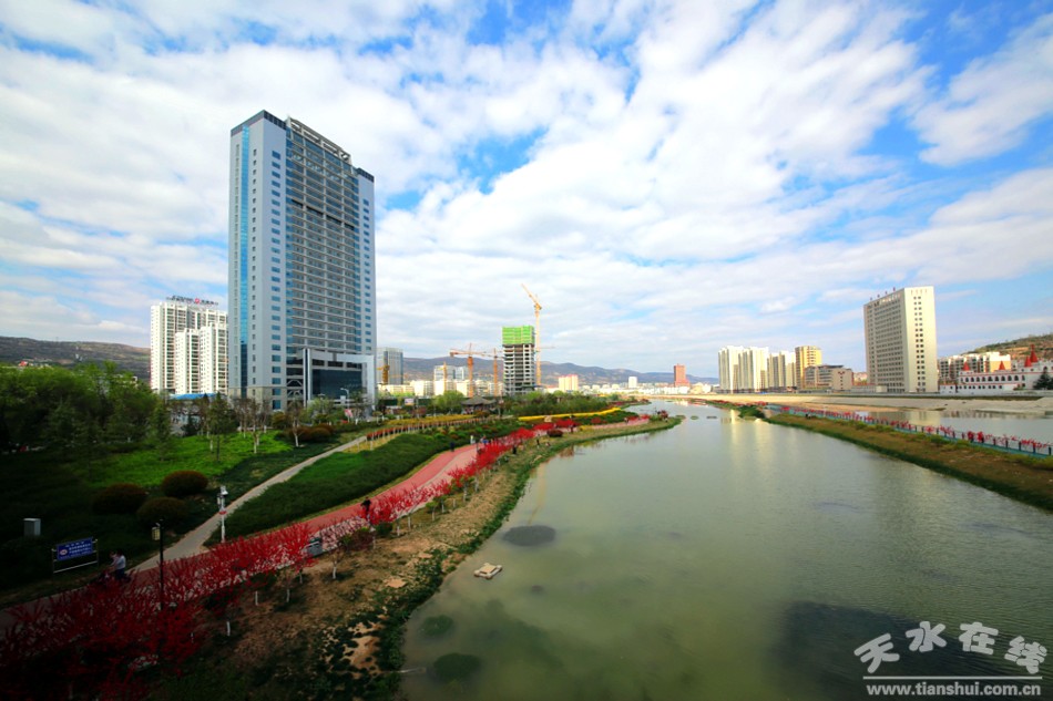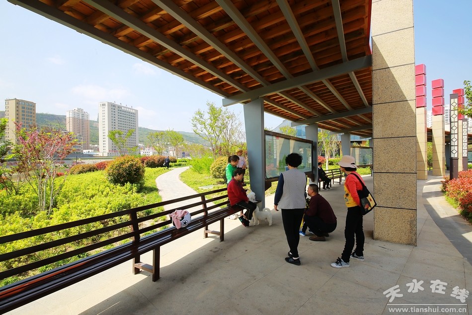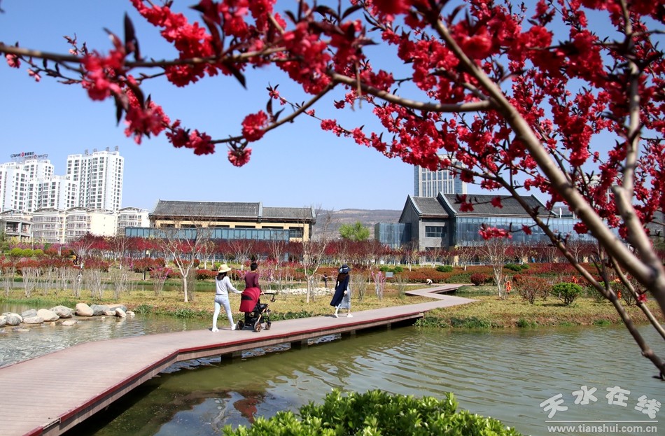 從紅橋到五里鋪橋頭,天水市藉河生態(tài)綜合治理一期續(xù)建工程,跌水源頭、水鏡花臺、城市陽臺、碧水花港、歡樂廣場等景觀已經(jīng)全面綻放,讓人耳目一新。水榭亭臺依依、小橋曲徑通幽、花壇步道婉轉(zhuǎn);湖水清澈明媚,藍(lán)天白云倒影婆娑,湖光山色處,花蹊如流動的溪水緩緩而動;翠柳含煙,櫻梅含情,鳶尾妖嬈,季節(jié)在風(fēng)里變換流轉(zhuǎn)。當(dāng)人們置身其間,頓覺古城天水已經(jīng)變成一座花園般的都市。