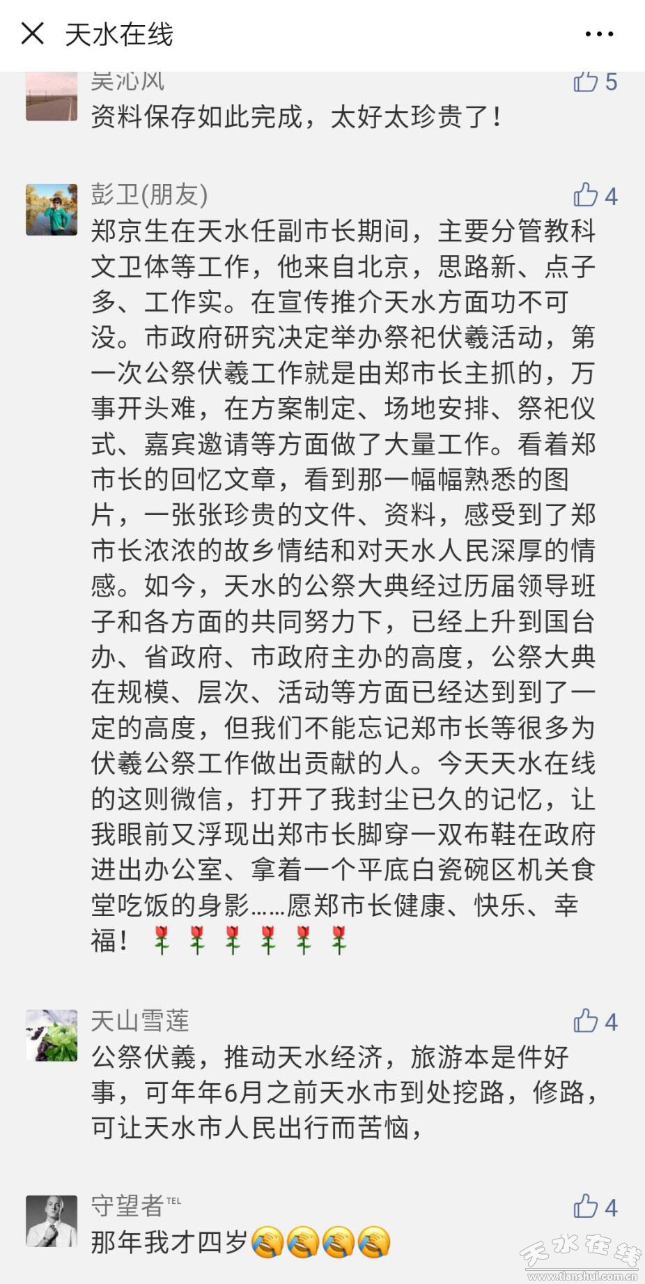 我看了你們發(fā)的新聞,實在太精彩了,你們搞得真好,處處是情義,篇篇憶往昔。我還看到不少天水人的留言,太感人了,太親切了,我很激動!三十年了,還有人記著我,怎不令人流下淚水,感謝天水人民!鄭京生(2019年5月24日) |