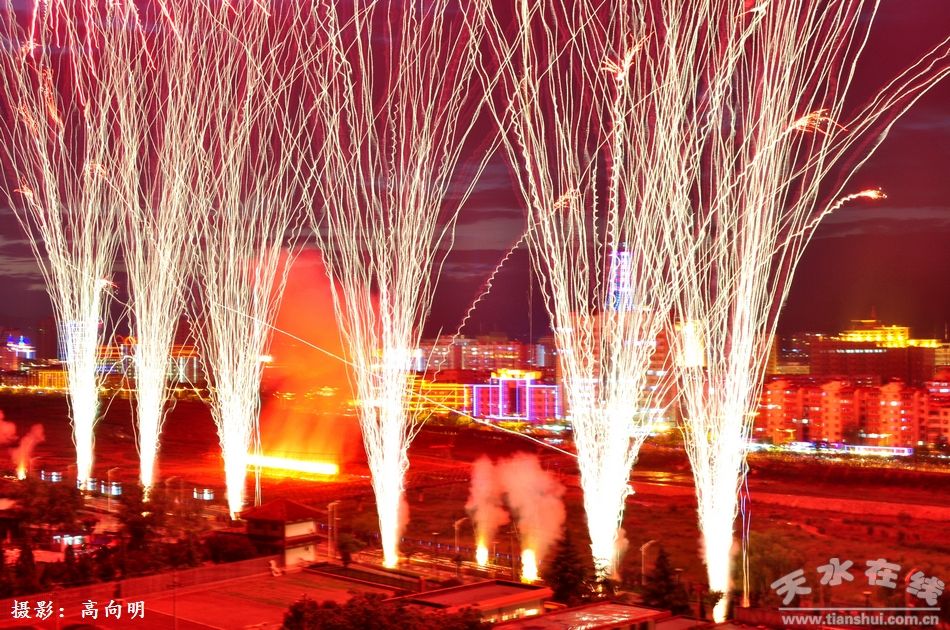 ▲晚九點(diǎn)整,音樂(lè)焰火晚會(huì)正式拉開了序幕。綠牡丹、黃千輪、金波藍(lán)、色連珠花以及各式中空禮花,穿插特效花束、燭光、虎尾等組合電腦特技表演的效果,活力四射、青春律動(dòng)、把和諧之美展示無(wú)余。絢爛的焰火爭(zhēng)奇斗艷,相互輝映,映亮了整個(gè)秦州夜空。