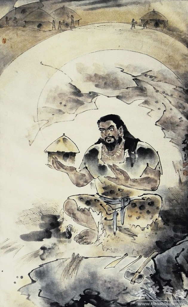 氏族社會(huì)時(shí),人們挖掘半地穴,搭建草蓬,形成半地穴式建筑!陡拭C人物志》述:“伏羲氏命大庭氏主居廬為民居住!苯,秦安大地灣遺址發(fā)掘出241座平地式的房屋遺址,說(shuō)明伏羲氏族時(shí)代,人類居住條件有了很大的改善。