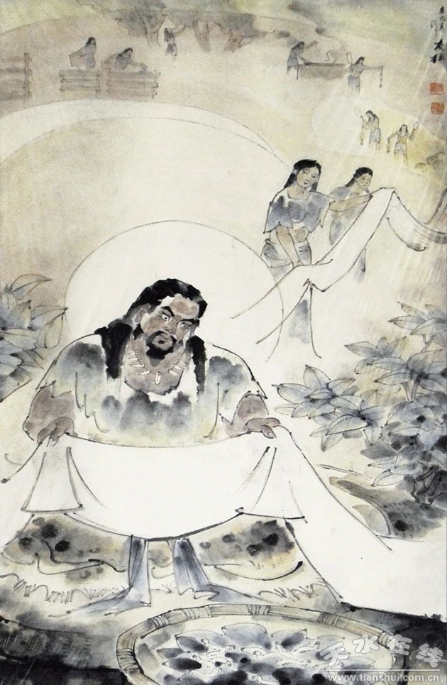 史載:“伏羲化蠶!比祟愒缙谟脴(shù)葉、獸皮充衣御寒!胺嘶Q化布”,教人們用蠶絲、植物纖維紡線、編網(wǎng)、織布、縫衣著裝,不僅使人們抵御寒冷的能力有了提高,而且文明程度進(jìn)一步發(fā)展。